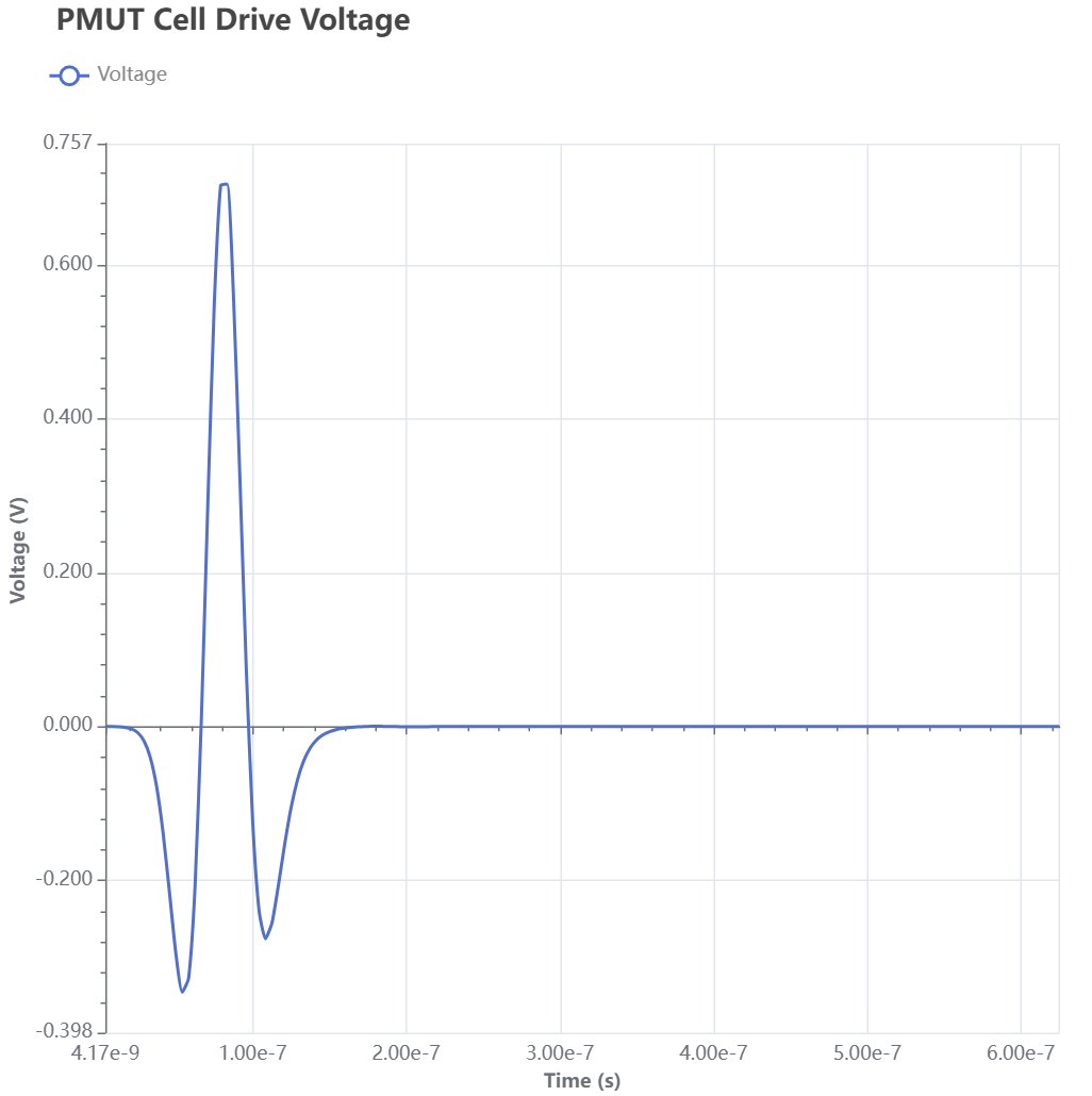 - Voltage and current: By simulating the voltage and current response of the PMUT cell, we gain insight into how the device behaves electrically. This is important for understanding the energy transfer process, the efficiency of the device, and the electrical characteristics that influence the performance of the PMUT cell in an array.
