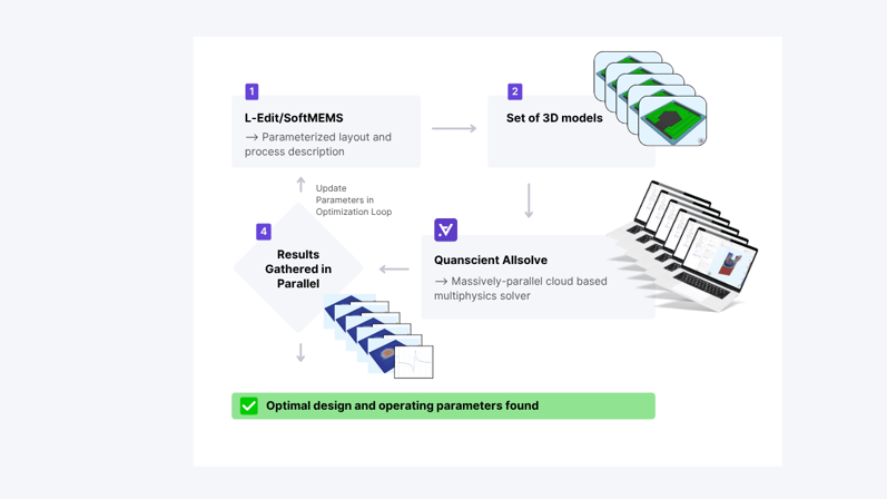 Integration with SoftMEMS and Siemens L-Edit allows automated 3D model generation from process design kits (PDKs), fabrication process descriptions and mask layouts, ensuring manufacturable, automated, and scalable workflows.