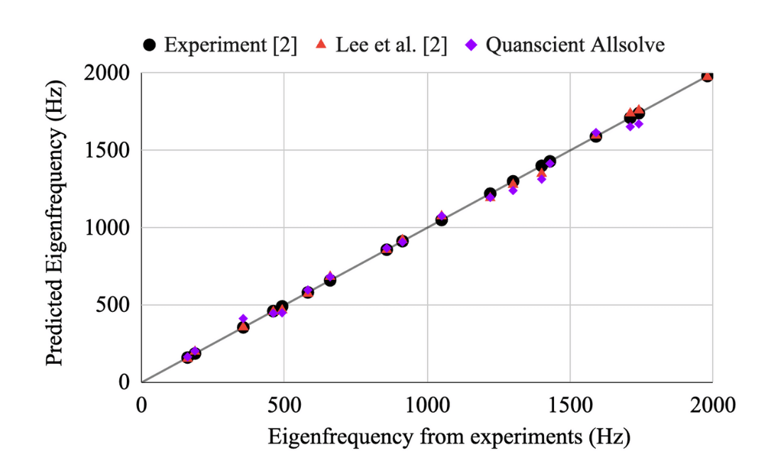 The script automatically ran 85 iterative eigenmode simulations in the cloud, adjusting the anisotropic elastic constants after every run to minimize the error between the simulation and physical drop-test data.